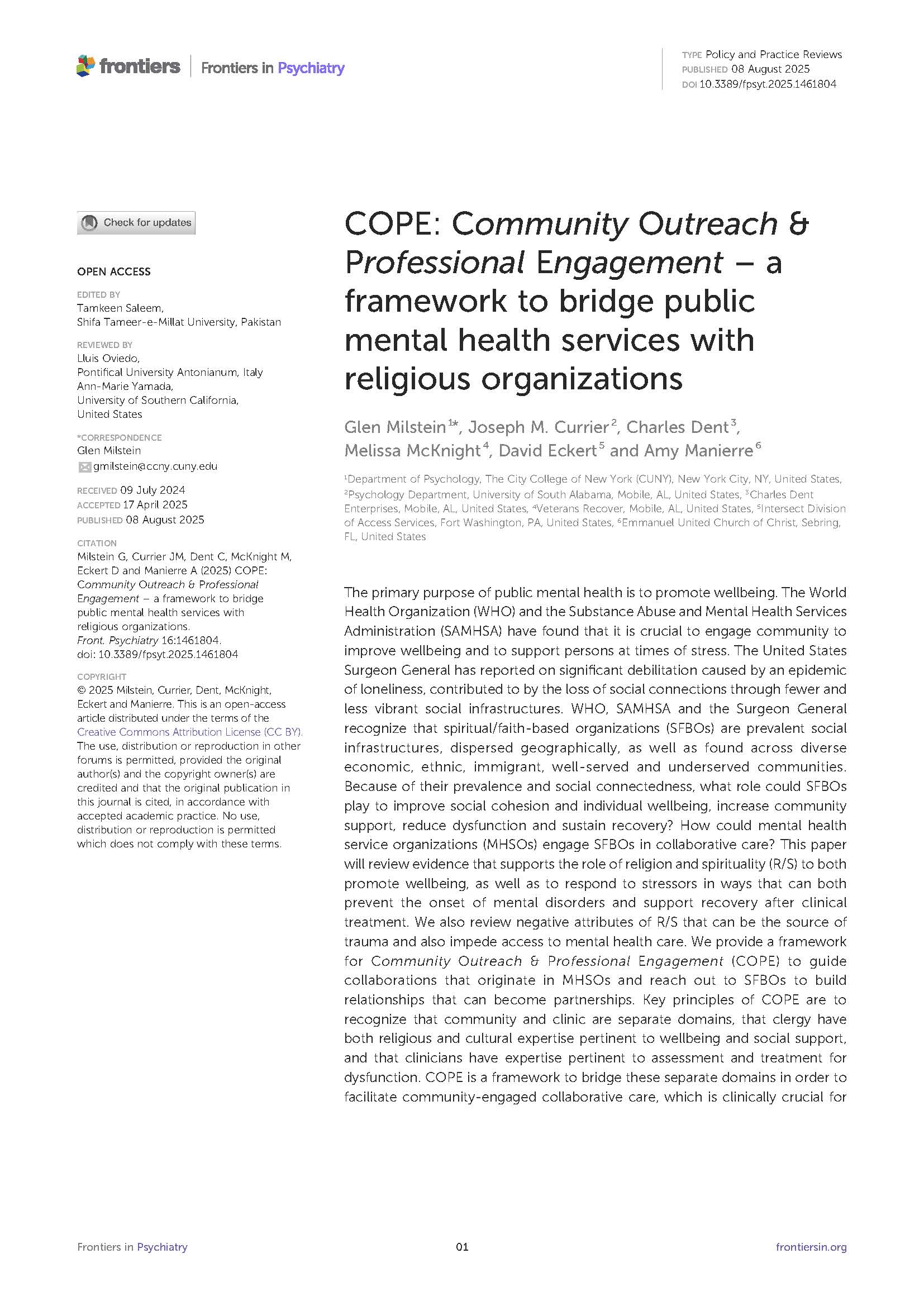Over time, Intersect has developed partnerships with those working in the academy. One of our strongest partners in recent years is Dr. Glen Milstein. Dr. Milstein is an Associate Professor of Psychology at The City College of New York. He studies and implements an integrative lifespan-development and prevention-science based program of Community Outreach & Professional Engagement (COPE), which facilitates the de facto continuum of care between community clergy and mental health clinicians. COPE investigates responses to emotional distress and mental disorders by religious communities, as well as responses to religiosity by clinicians. His community-based participatory research includes people with lived experience and their families. Intersect’s Dave Eckert is one of the contributors to Dr. Milstein’s recently published article on the COPE framework below.